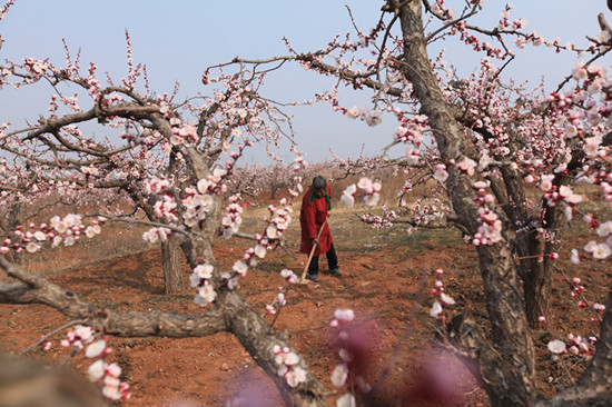 春分時(shí)節(jié),隨著天氣回暖,山東省平邑縣地方鎮(zhèn)10萬株杏樹花開爭(zhēng)艷,當(dāng)?shù)剞r(nóng)民搶抓農(nóng)時(shí)加強(qiáng)花期管理,一派人勤春早忙碌景象。武紀(jì)全攝
