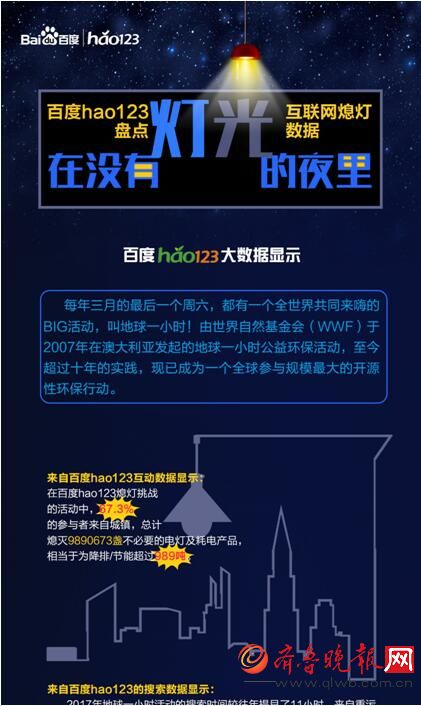 近日,百度hao123推出地球一小時(shí)解讀盤點(diǎn),依托于百度hao123搜索大數(shù)據(jù)和百度hao123熄燈挑戰(zhàn)活動(dòng)的互動(dòng)數(shù)據(jù),將地球一小時(shí)的互聯(lián)網(wǎng)參與數(shù)據(jù)進(jìn)行深度還原。諸如“有多少人與我們同行”、“2017地球一小時(shí)活動(dòng)的影響力”等一系列的互聯(lián)網(wǎng)數(shù)據(jù)將一一展現(xiàn)在我們眼前,讓關(guān)注活動(dòng)和參與其中的你深刻感受到:你的環(huán)保行動(dòng)不孤單!