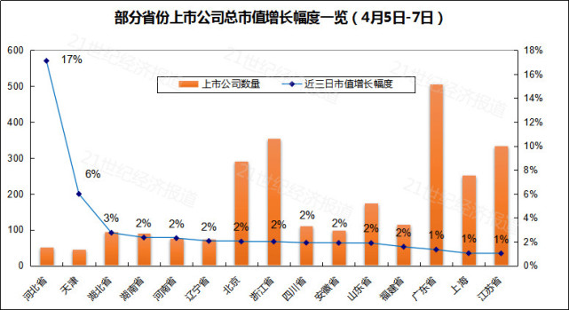 據(jù)21數(shù)據(jù)新聞實驗室統(tǒng)計,4月4日-7日期間,河北省的上市公司總市值增長了1433億元,增長幅度為17%,遙遙領(lǐng)先,甚至遠超過廣東省、浙江省等其他13個省份,而該13省份的上市公司數(shù)量遠遠超過河北省和天津市(如圖所示)。