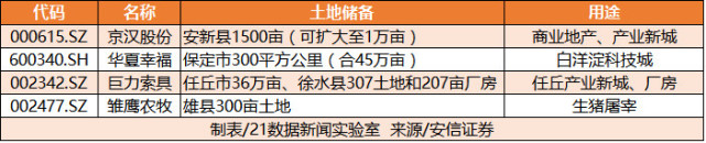 從所屬行業(yè)看,房地產(chǎn)開發(fā)的最多,共5家,其次為水泥制造、綜合。值得一提的是,部分上市公司在雄安新區(qū)的土地儲備情況十分可觀,比如: