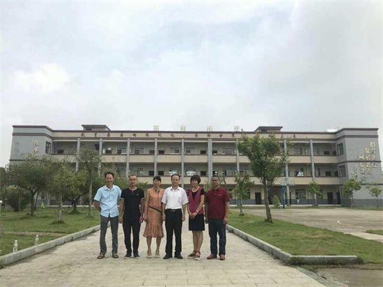賴業(yè)勇(右一)、賴劍(左二)和主編賴衍先(右三)與賴孝烈全資捐建的水嶺小學(xué)的領(lǐng)導(dǎo)班子校長朱麗萍(右二)、李春清主任(左三)、羅斌主任(左一)合影