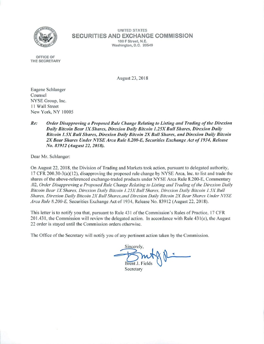 美國證券交易委員會秘書長Brent Fields在寫給紐約證券交易所集團高級律師David De Gregorio的信中寫道: