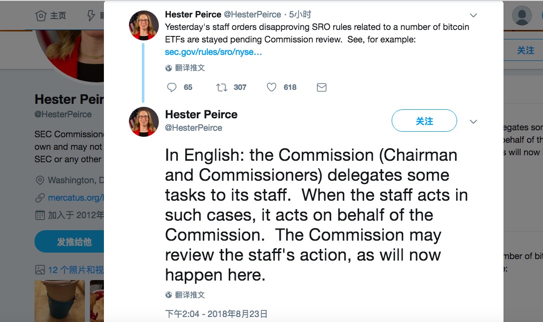 而在后續(xù)的推文當(dāng)中,Peirce委員解釋了美國證券交易委員會為何決定重新審查。