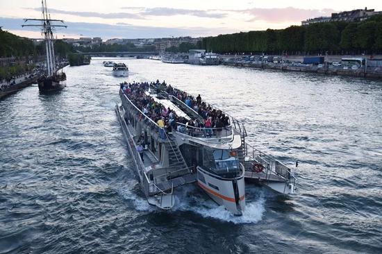 2016年5月7日,在法國巴黎,一艘滿載游客的觀光船行駛在塞納河上。(新華社記者李根興攝)