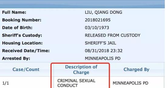 根據(jù)美國明尼蘇達州hennepin監(jiān)獄公開信息,8月31日晚23:32,有一名名叫“Liu Qiangdong “的人士因為”criminal sexual conduct”(性侵)在當?shù)乇徊?,并?月1日16:05獲釋,保釋金為零。