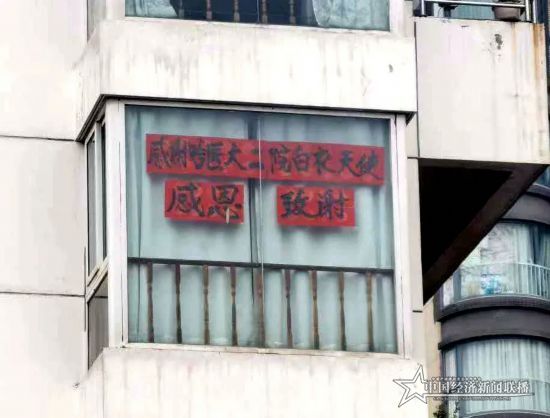 駐地對(duì)面的居民樓上寫著“感謝哈醫(yī)大二院白衣天使”幾個(gè)大字;