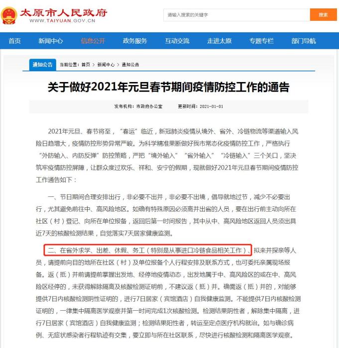 如山西太原市要求,在省外求學(xué)、出差、休假、務(wù)工(特別是從事進(jìn)口冷鏈?zhǔn)称废嚓P(guān)工作)、擬來(lái)并探親等人員,請(qǐng)?zhí)崆跋蚰康牡厮谏鐓^(qū)(村)及單位報(bào)備個(gè)人行程安排及聯(lián)系方式。