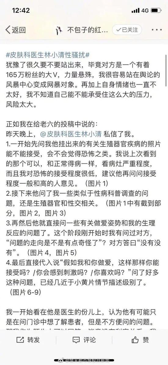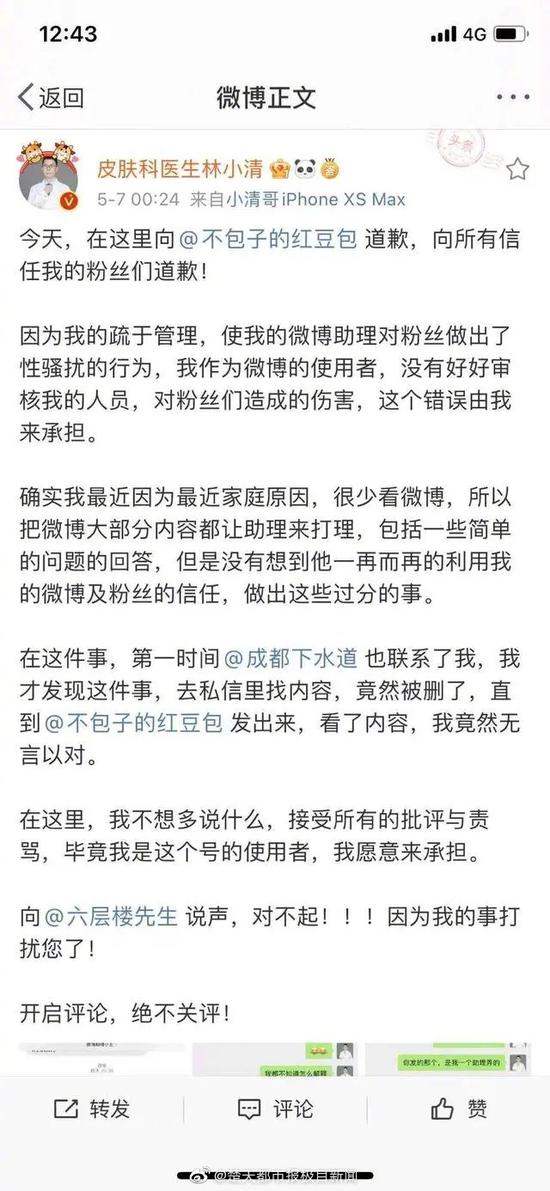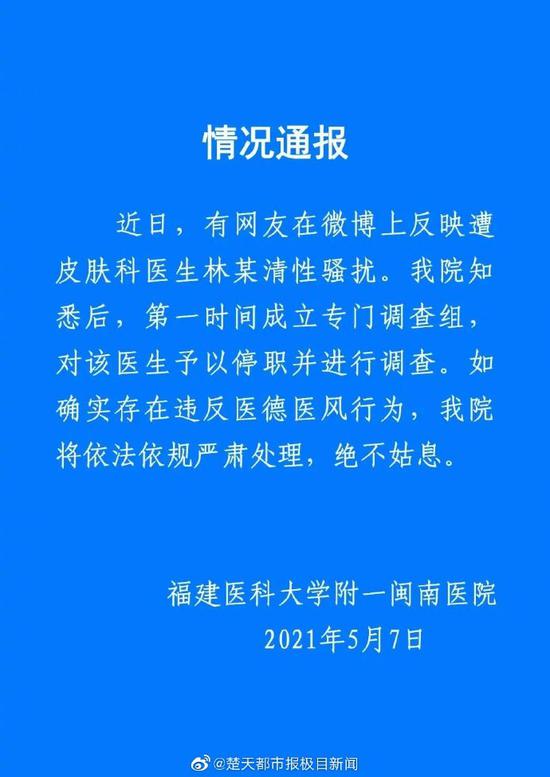 @楚天都市報(bào)極目新聞 5月8日消息,5月6日晚22點(diǎn)45分,微博網(wǎng)友發(fā)帖爆料稱,自己遭到微博大V醫(yī)生@皮膚科醫(yī)生林小清?的性騷擾。5月7日凌晨,當(dāng)事醫(yī)生致歉稱性騷擾粉絲是助理所為。對(duì)此爆料者表示,林小清的道歉和回復(fù)非常缺乏誠(chéng)意,而且在侮辱大家的智商,自己手上已經(jīng)掌握是對(duì)方本人在騷擾自己的證據(jù),且不少人告知自己也有類似的遭遇,自己正在著手收集證據(jù),準(zhǔn)備向公安機(jī)關(guān)報(bào)案。5月8日,極目新聞?dòng)浾邚母=ㄡt(yī)科大學(xué)附屬第一醫(yī)院閩南分院了解到,