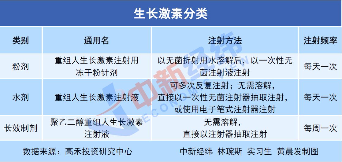 長春高新2020年年報顯示,其控股子公司金賽藥業(yè)生產(chǎn)的生長激素有三種類型,分別為注射用重組人生長激素(粉針劑)、重組人生長激素注射液(水針劑)、聚乙二醇重組人生長激素注射液(長效水針劑)等人生長激素系列產(chǎn)品。