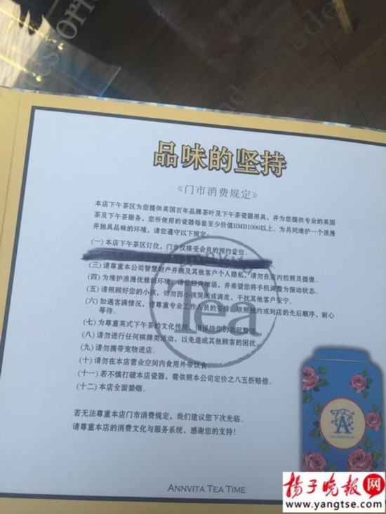 這名工作人員隨后翻開菜單,只見首頁上有一條本店消費(fèi)須知,其中一條即是客人不小心打破瓷器需按照銷售價格的85折進(jìn)行賠償?!斑@樣的規(guī)定也是‘安薇塔英國茶屋’所有門店的統(tǒng)一規(guī)定?!惫と藛T介紹,魏女士一行5人當(dāng)天使用的瓷器含一壺、一杯、一碟,杯子打碎了,當(dāng)時魏女士也接受的賠償金額,并且付款,他們就將另外部分打包,讓魏女士帶走。