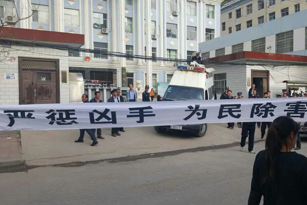 被害人親屬打出條幅“嚴懲兇手 為民除害”