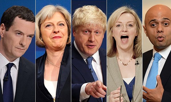 英國首相熱門候選人:喬治·奧斯本(George Osborne), 特蕾莎·梅(Theresa May), 鮑里斯·約翰遜(Boris Johnson),伊麗莎白·特拉斯(Elizabeth Truss),賈維德(Sajid Javid)