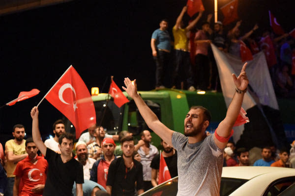 7月18日,在土耳其伊斯坦布爾的阿塔圖爾克機(jī)場,民眾參加支持總統(tǒng)埃爾多安的集會(huì)。