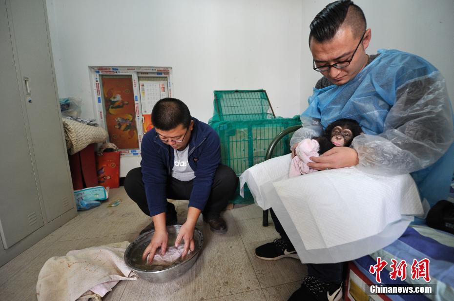 11月1日,山西太原動物園,飼養(yǎng)員“奶爸”照顧半歲大的“棄嬰”小猩猩。2016年5月2日,該園雌性黑猩猩“老七”順利產(chǎn)下寶寶。因為這批非洲黑猩猩系首次繁育,缺乏經(jīng)驗,“老七”把孩子晾在一邊,不聞不問,小猩猩成為一名“棄嬰”。于是,飼養(yǎng)員吳晉源、劉嶂鑫、趙璟、朱向博將小猩猩抱回育嬰室,當(dāng)起了全職奶爸,給它梳洗喂奶,教它翻身站立,期待小猩猩長大后能夠順利回歸種群。圖為一位“奶爸”洗毛巾,一位“奶爸”安撫小猩猩。 韋亮 攝