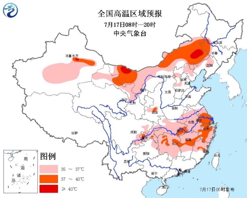 預(yù)計(jì),7月17日白天,內(nèi)蒙古大部、吉林西部、遼寧北部、甘肅中西部、陜西關(guān)中地區(qū)、江漢、江淮、江南、重慶和新疆南疆盆地等地有35℃以上的高溫天氣,其中,內(nèi)蒙古西部和東部偏南地區(qū)、甘肅西部、浙江大部、江蘇南部、上海、江西中部、福建中部、湖北東南部、湖南中東部、重慶南部及新疆南疆盆地等地的部分地區(qū)最高氣溫可達(dá)37~39℃,局地可超過40℃。