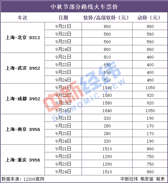 以中秋節(jié)從上海出發(fā)為例。中新經(jīng)緯客戶端查詢上海-北京、上海-武漢、上海-成都、上海-南京、上海-重慶等線路部分車次,發(fā)現(xiàn)中秋節(jié)前一日(21日)和最后一日(24日)的火車票價(jià)格較高,與22日、23日相比,要高出20-300元不等。以上海-北京D312車次為例,21日軟臥和動(dòng)臥票價(jià),均比22日高出300元。