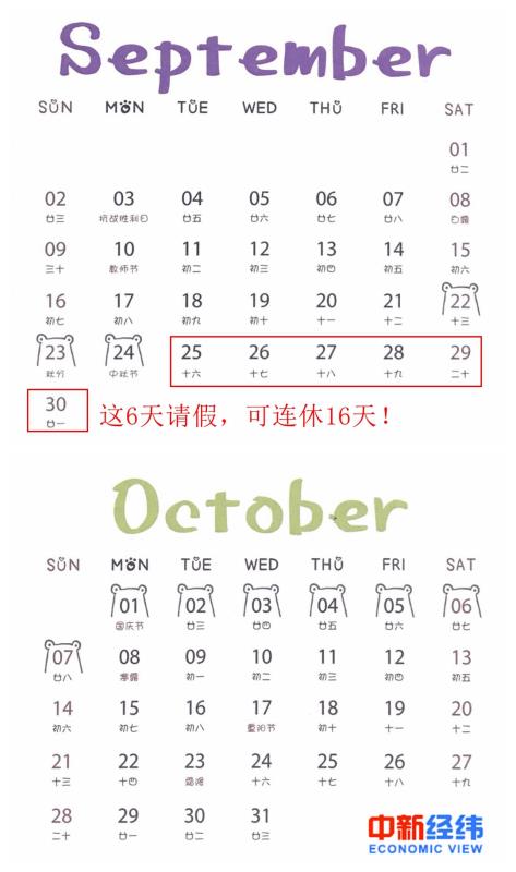 據(jù)悉,今年中秋節(jié)放假時(shí)間為9月22日至24日,國(guó)慶節(jié)放假時(shí)間為10月1日至7日。只要能在25日-30日請(qǐng)假6天,中秋節(jié)和國(guó)慶節(jié)便可連休16天。