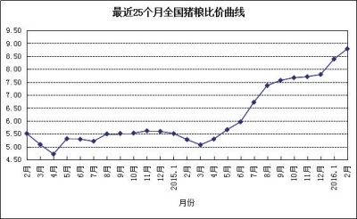 據(jù)對全國500個農(nóng)村集貿(mào)市場畜產(chǎn)品和飼料價格定點監(jiān)測,2016年2月份,生豬產(chǎn)品、家禽產(chǎn)品、牛羊肉和豆粕價格上漲,生鮮乳價格持平,玉米和肉雞配合飼料價格下跌。按農(nóng)貿(mào)市場監(jiān)測口徑,2月豬糧比價為8.79∶1,比1月上升0.40個點。