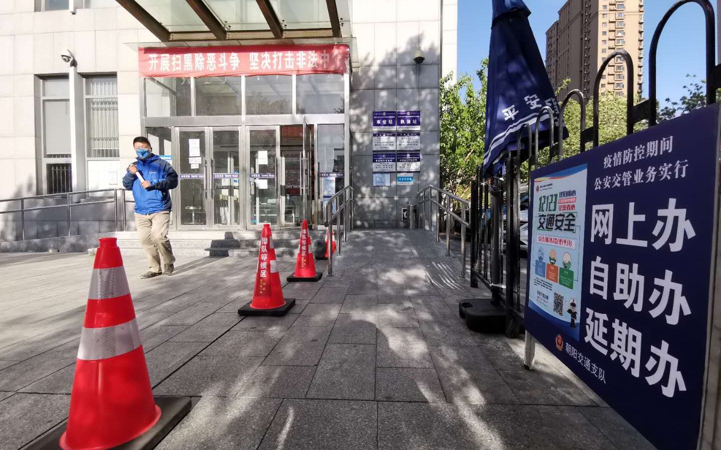 朝陽交通支隊執(zhí)法站外,張貼著提醒市民通過網(wǎng)絡辦理的宣傳海報。新京報記者 裴劍飛 攝