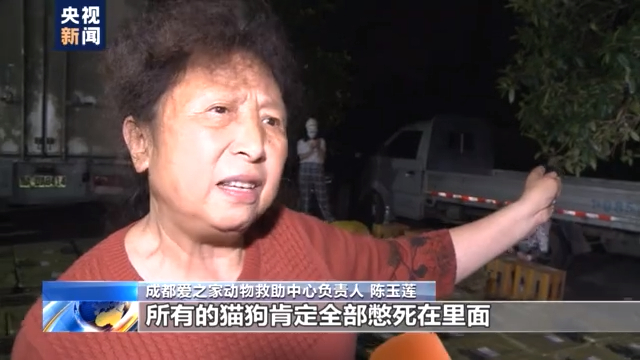 成都愛之家動物救助中心負責人 陳玉蓮:這個車子拖了一車(貓狗)過來,總數(shù)是156只,然后我們就追隨過來,然后他們就把車上的貓狗轉上到這個車。大家看一下這個廂式貨車,全封閉的,把兩道后門一關,所有的貓狗肯定全部憋死在里面。