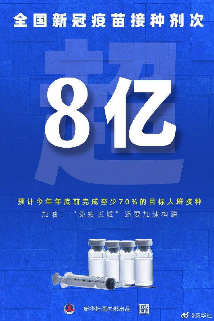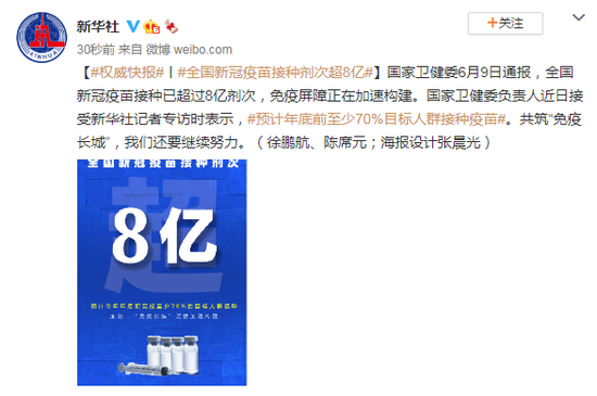 國(guó)家衛(wèi)健委6月9日通報(bào),全國(guó)新冠疫苗接種已超過(guò)8億劑次,免疫屏障正在加速構(gòu)建。國(guó)家衛(wèi)健委負(fù)責(zé)人近日接受新華社記者專訪時(shí)表示,預(yù)計(jì)年底前至少70%目標(biāo)人群接種疫苗。共筑“免疫長(zhǎng)城”,我們還要繼續(xù)努力。