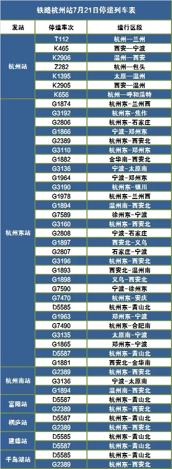 受連日河南特大暴雨影響,杭州往鄭州方向多趟列車停運(yùn),鐵路杭州站目前梳理了21日部分停運(yùn)列車車次信息,具體如下: