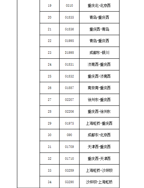 停運(yùn)普速列車87列,車次為:K118、K262、K268、K385、K386、K473、K474、K4363、K4364、K7707、K7708 、T10、T56、T232、Z130、Z152、K402、T50、T168、T167、T290、T289、Z286、K1275、Z53、K179、K599、T369、Z235、T123、K21、K2285、K22、Z2、K968、T146、Z90、T370、Z208、Z6、Z336、Z14、T124、K818、K508、K507、Z150、Z149、Z202、Z162、K158、K1276、Z4、Z96、Z50、Z54、T254、Z236、K636、K234、K635、Z161、K817、Z49、K117、T253、K2286、K967、Z13、T145、K233、K267、T55、T167、T9、T49、Z129、Z151、Z5、K261、Z89、Z3、Z201、Z1、K157、Z285、Z36。