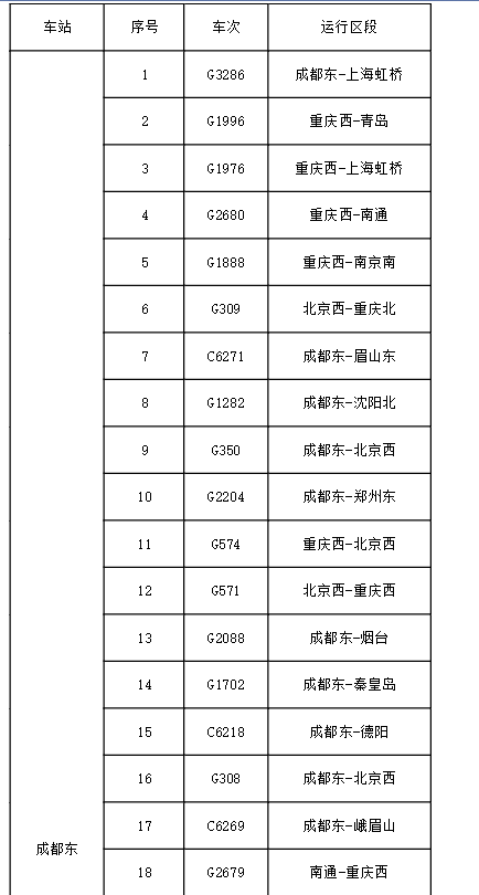 受河南暴雨影響,7月21日,中國(guó)鐵路成都局集團(tuán)公司成都車站管內(nèi)42趟列車停運(yùn),包括到上海、青島、北京等方向,具體車次如下: