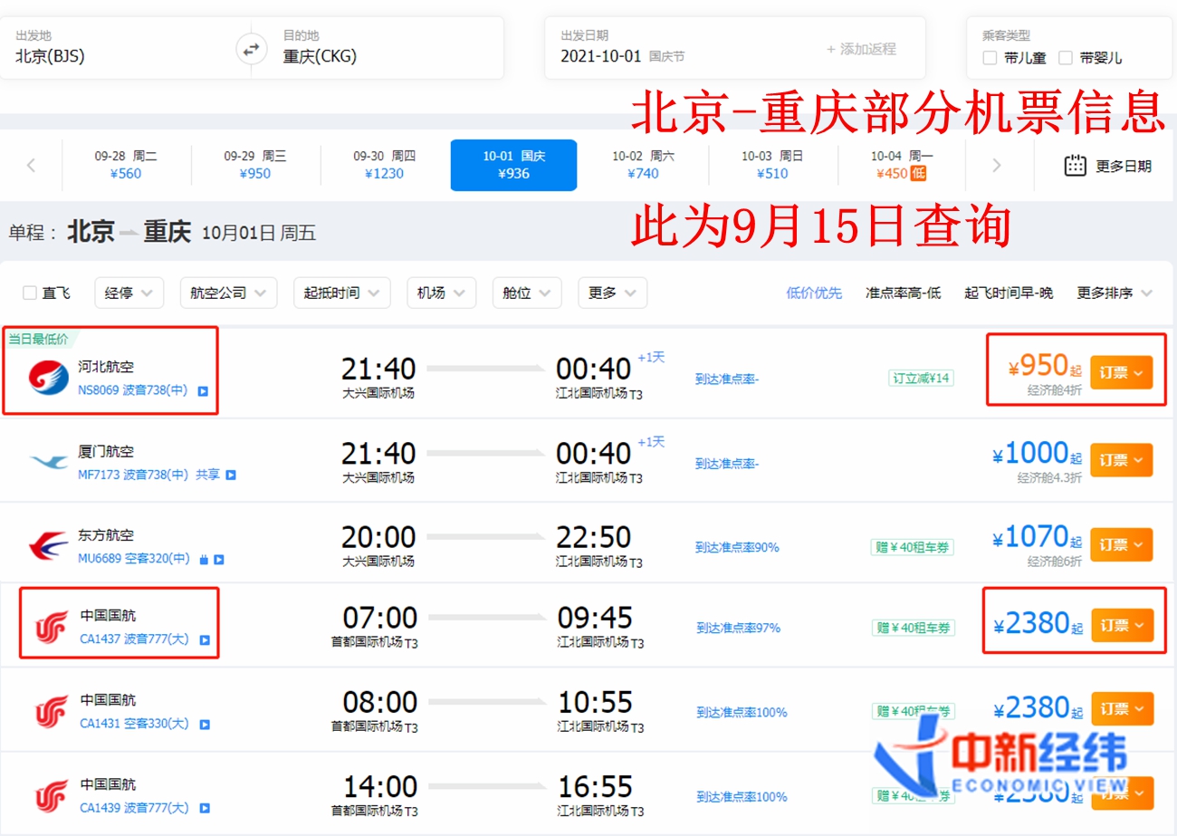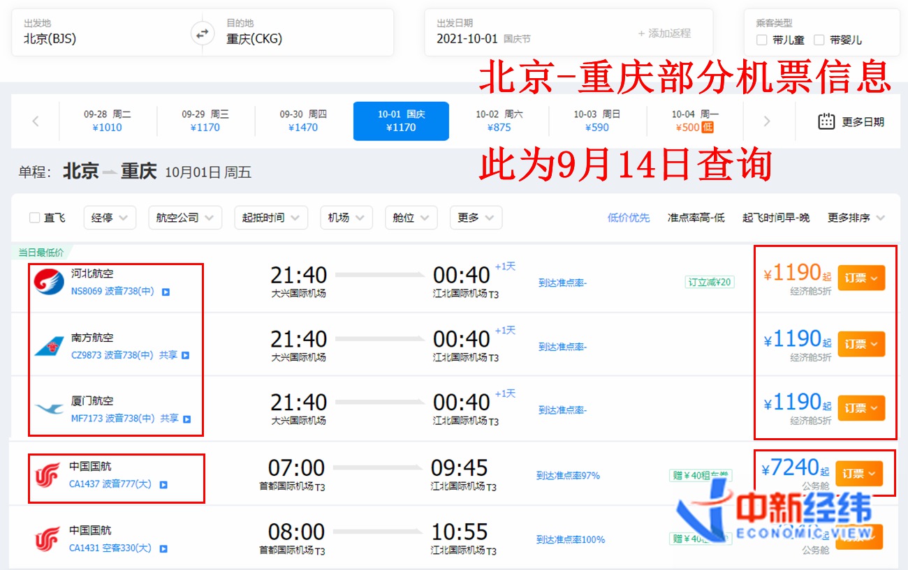 如:9月14日,中新經(jīng)緯客戶端查詢第三方購票平臺(tái),10月1日北京-重慶的航班信息顯示,當(dāng)日最低機(jī)票價(jià)格為1190元(機(jī)票價(jià)格均不含燃油附加費(fèi)),航班有河北航空NS8069、南方航空CZ9873、廈門航空MF7173三個(gè)班次;公務(wù)艙方面,中國國航的CA1437航班機(jī)票價(jià)格高達(dá)7240元。