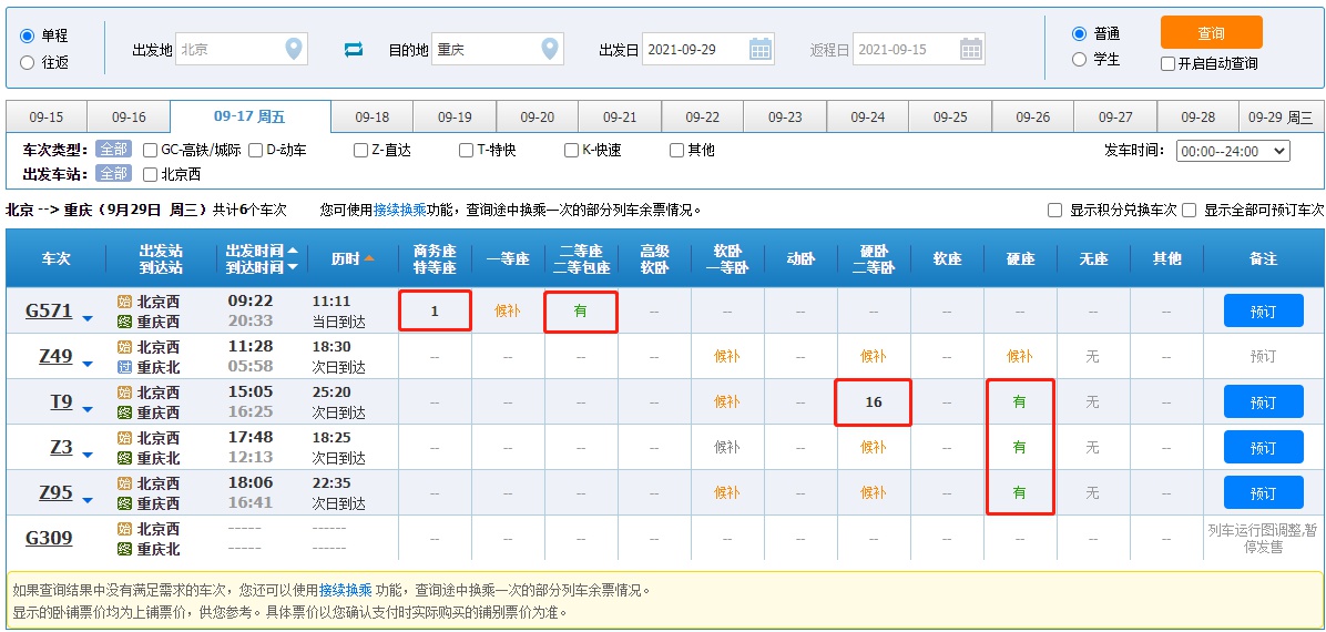 9月29日北京-重慶余票情況。來源:12306網(wǎng)站